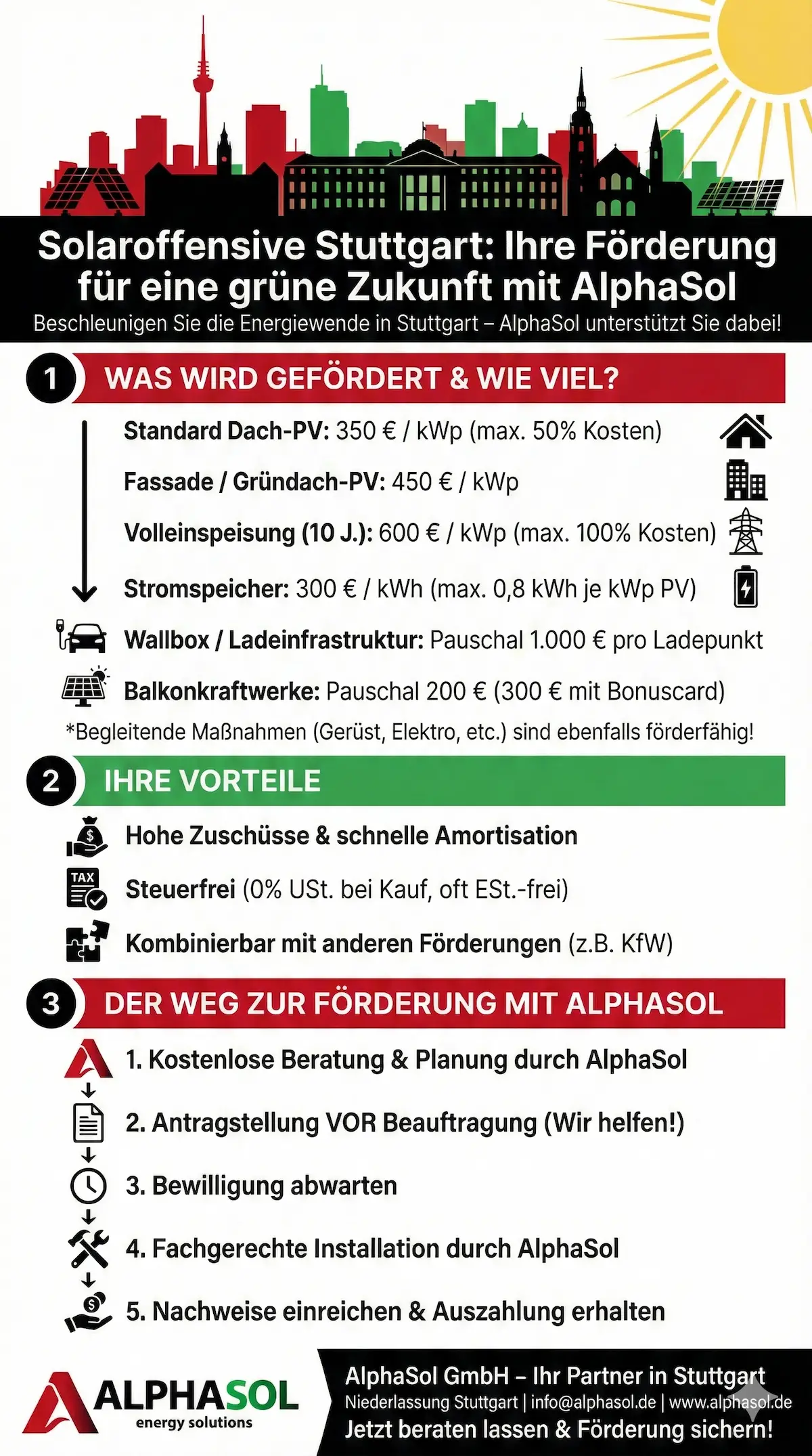 Durch die Solaroffensive der Stadt Stuttgart werden Photovoltaik‐Anlagen, steckerfertige Balkon‐PV‐Systeme (BPV), Stromspeicher und Ladeinfrastruktur im Gebiet der Landeshauptstadt Stuttgart gefördert.